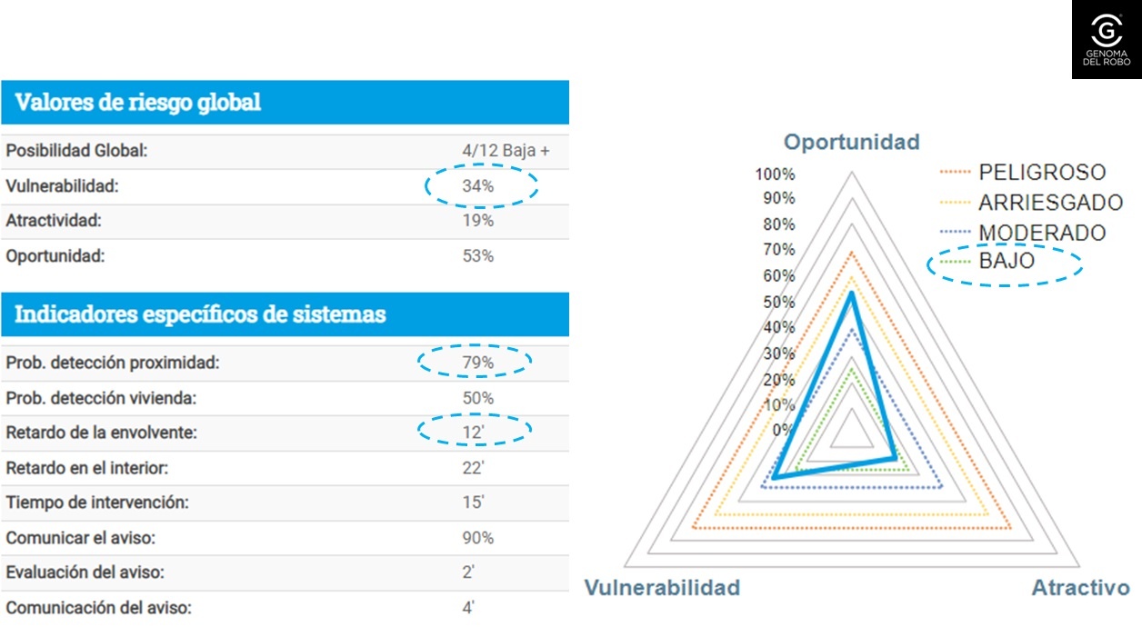 Con los datos objetivos extraídos del pro evaluador de seguridad residencial, comparando las dos soluciones en un segundo piso no escalable, dentro de un portal de vecinos, con dos vecinos por rellano, la vivienda desocupada en tiempo de trabajo, puerta blindada y sistema de detección inalámbrica,