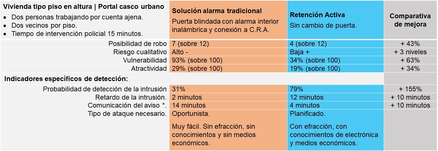 Con los datos objetivos extraídos del pro evaluador de seguridad residencial, comparando las dos soluciones en un segundo piso no escalable, dentro de un portal de vecinos, con dos vecinos por rellano, la vivienda desocupada en tiempo de trabajo, puerta blindada y sistema de detección inalámbrica,