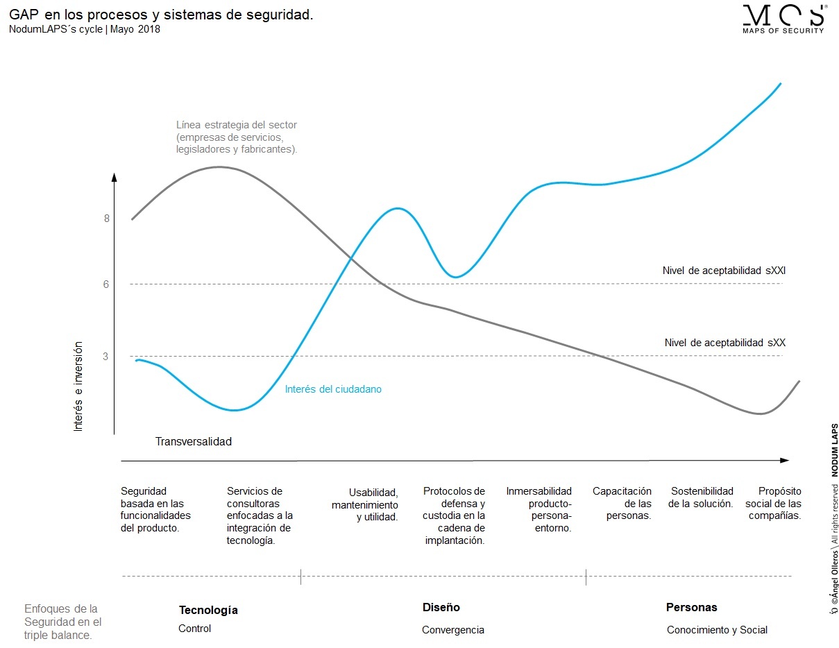 Al introducir el ciclo de interés del delincuente se observa aún más el tremendo GAP entre lo que ofrecen los sistemas y lo que interesa al delincuente. Cabe destacar que el ciudadano y el delincuente están mas alineados que el usuario y el fabricante, lo cual no sorprende a la vista de poca eficacia que muestran los sistemas contra el delito en términos de intrusión y abuso de confianza. Puedes informarte un poco más del concepto de la inseguridad asegurada.
