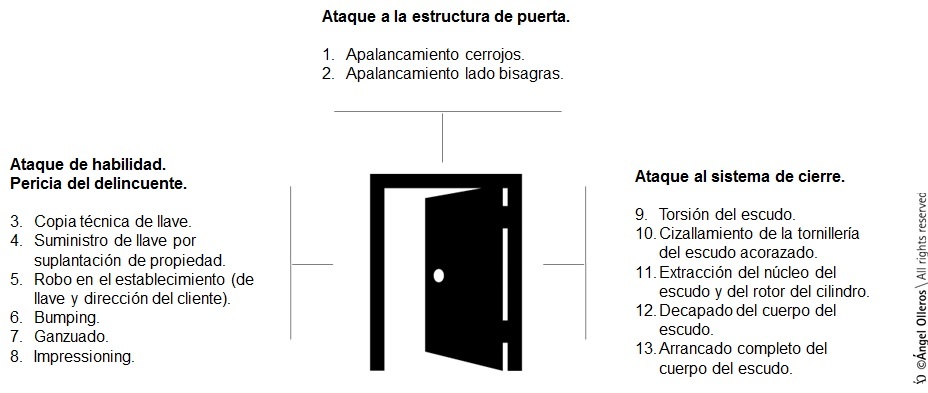 Como primer punto hay que tener bien presente que hoy en día existen hasta 13 tipologías de ataque, bien conocidas y de uso totalmente habitual para abrir puertas de viviendas, ya sean de madera, blindadas o acorazadas.